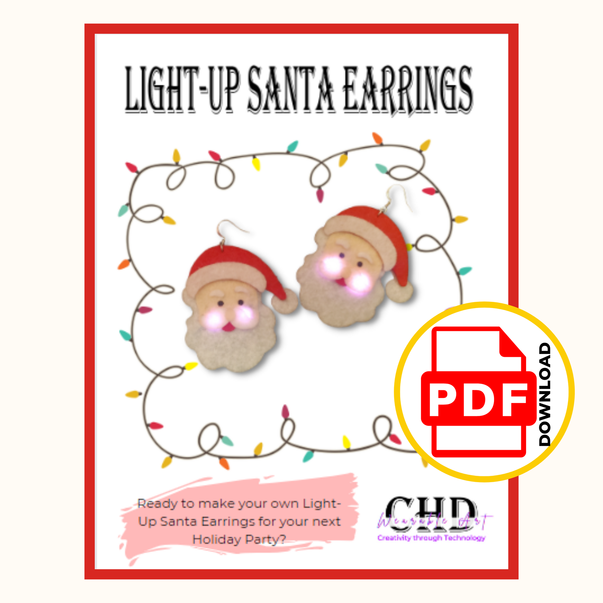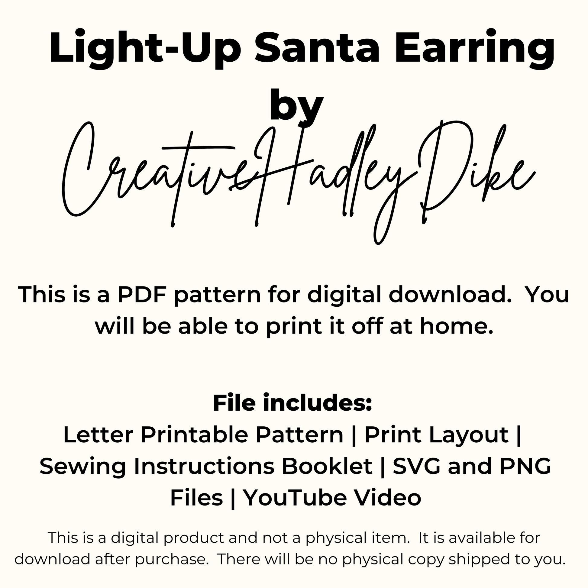 Introducing Light-Up Santa Earrings Pattern! This fantastic little PDF pattern will have you creating stunningly unique earrings in no time. What makes these Light-Up Santa Earrings so special? Well, not only do they feature an adorable design of Santa, but they also light up when you give them power! This pattern comes with all the instructions and files you'll need to get started, including the SVG and PNG files for the design as well as the detailed sewing instructions. Plus, you can follow along with a helpful YouTube video to make sure you're getting it just right! So give yourself a unique and merry hand-crafted gift this holiday season, and get your Light-Up Santa Earrings Pattern today!