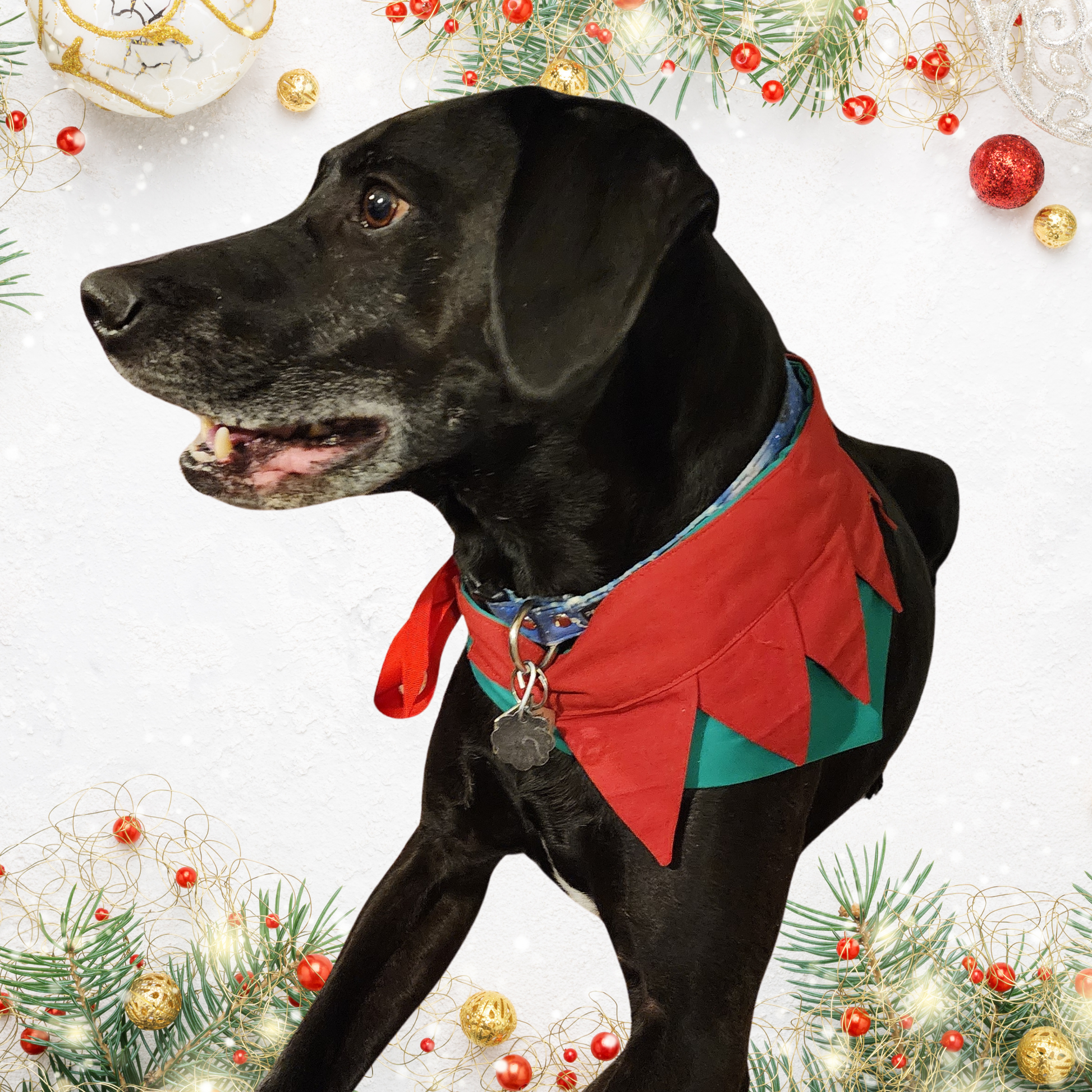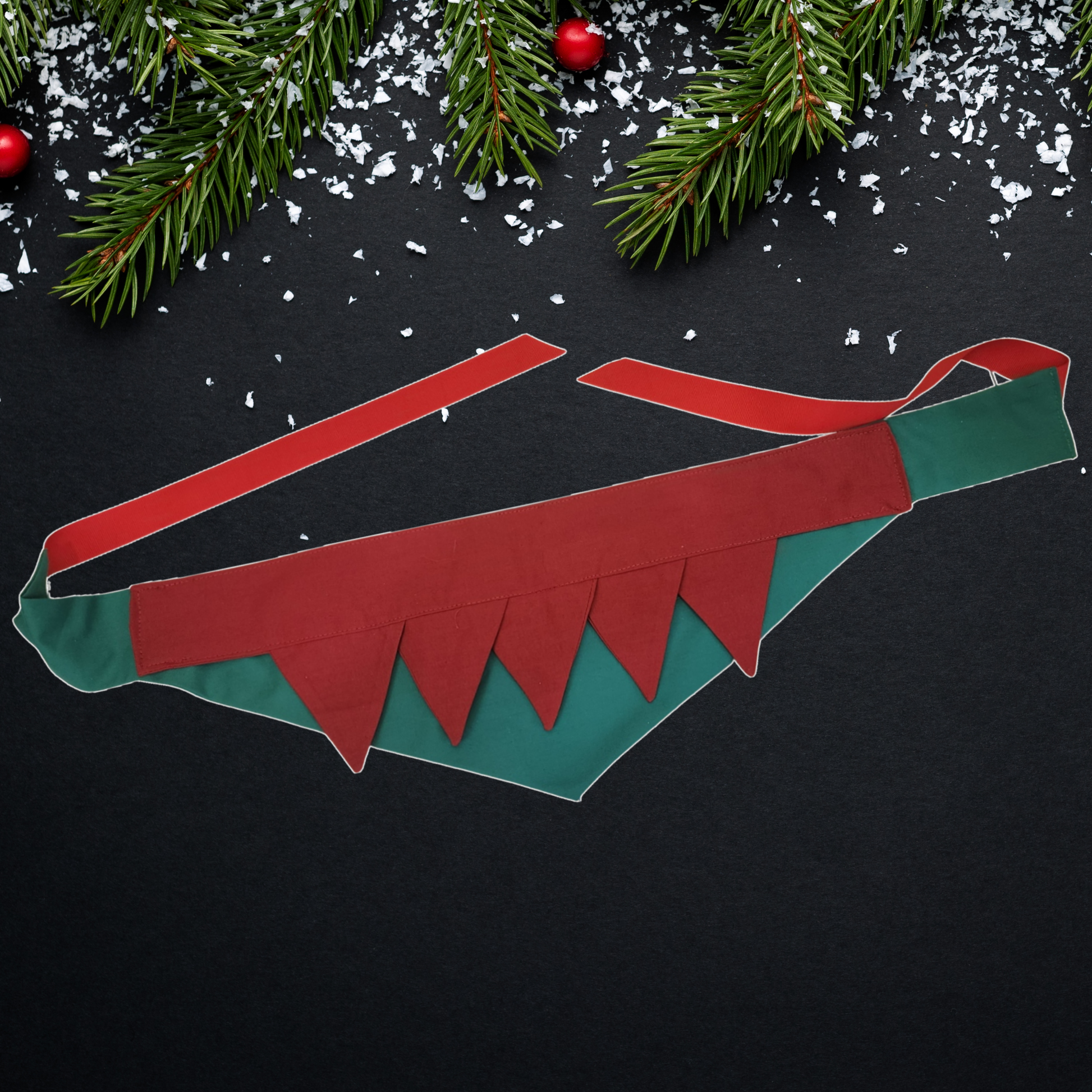 This playful pointed elf-style collar ties on, requires no special hardware, and is not load-bearing, making it safe and comfortable for everyday holiday wear.