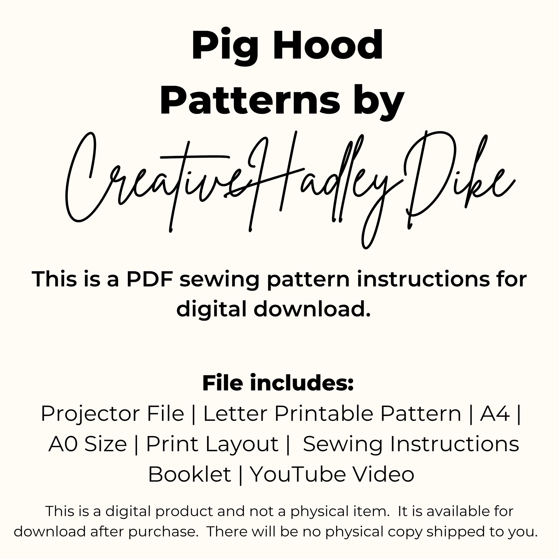 Pig Hood Sewing Pattern, PDF + Projector 8-Sizes